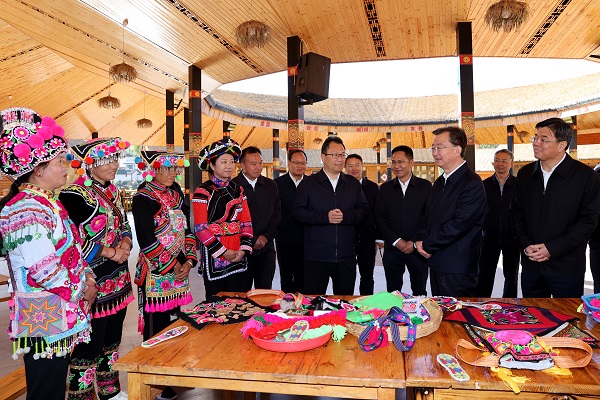 大姚縣紫丘村移民搬遷十年來,群眾生產(chǎn)生活發(fā)生巨變。王寧走進彝繡坊、粉絲加工車間,向繡娘、合作社負責人詳細了解群眾就業(yè)方式、增收情況。他強調(diào),基層組織力是群眾增收的堅強保障,要創(chuàng)新組織模式,挖掘好家門口的資源,拓寬家門口的增收路子。