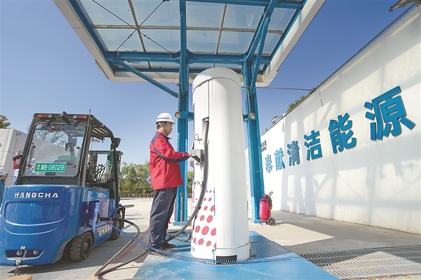 在中國石化燕山石化公司的加氫站,一名工作人員在為一輛氫能叉車加氫氣。新華社記者 鞠煥宗 攝