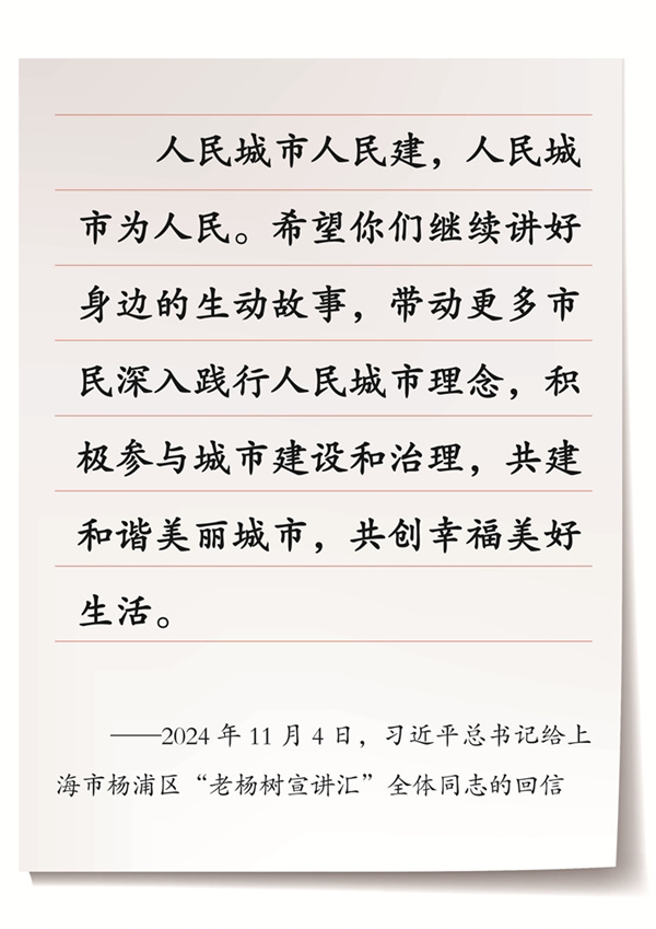 “人民城市人民建,人民城市為人民。希望你們繼續(xù)講好身邊的生動(dòng)故事,帶動(dòng)更多市民深入踐行人民城市理念,積極參與城市建設(shè)和治理,共建和諧美麗城市,共創(chuàng)幸福美好生活。”前不久,習(xí)近平總書記給上海市楊浦區(qū)“老楊樹宣講匯”全體同志回信,對(duì)他們表示親切問候并提出殷切希望。