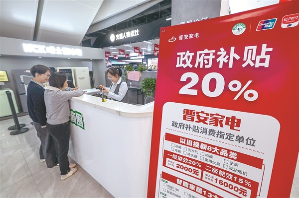 圖為顧客在浙江省杭州市晉安家電的收銀臺辦理政府家電以舊換新補貼的申領手續(xù)。 新華社記者 徐昱 攝