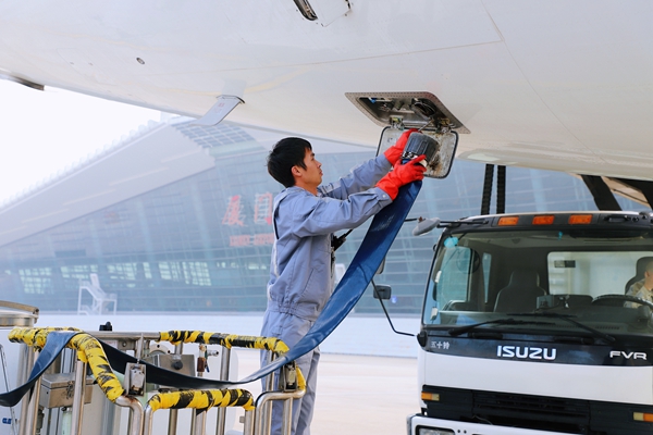 春運期間,廈門機場工作人員堅守崗位保障航班,服務每一位旅客順利出行。圖為廈門機場工作人員在機坪檢修飛機零部件。(廈門市紀委監委供 韓慧 攝)
