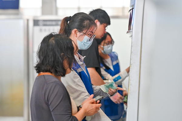 近日,在海南省陵水黎族自治縣動車站,常常能看到身穿藍色馬甲的志愿者身影。圖為志愿者在自助窗口幫助旅客購票,保障旅客平安出行。(海南省陵水黎族自治縣紀委監委 姜祖鵬 攝)