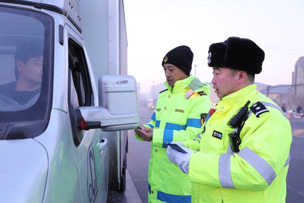 黑龍江省杜爾伯特蒙古族自治縣公安機關干警堅守崗位“不打烊”,頂著風雪嚴寒檢查道路交通安全,用“敬業福”換來群眾“平安福”。(黑龍江省杜爾伯特蒙古族自治縣紀委監委 吳旭萍 攝)