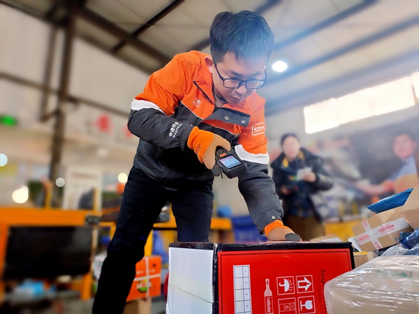 傳送帶上,快遞包裹接踵而來,分揀員們有序進行掃碼、分揀、發貨……電商物流科技產業園春節不打烊,員工堅守崗位配送包裹,傳遞節日溫暖。(重慶市巴南區紀委監委供 王珊 攝)
