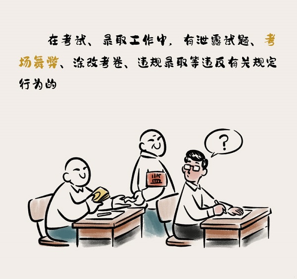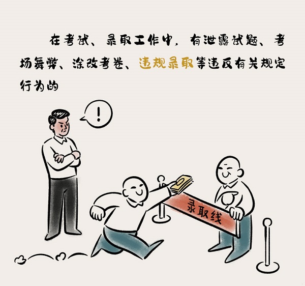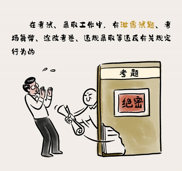 能否嚴格按照規定開展考試、錄取工作,做到公開公正、競爭擇優,關系到黨和國家事業發展,關系到社會公平正義。承擔考試、錄取工作任務的黨員、干部,必須提高思想認識,認真履行職責,嚴格遵守紀律規定,維護考試、錄取工作良好秩序。對于違反規定者,應當按有關規定嚴肅處理;對于其中的黨員,還應當依照《中國共產黨紀律處分條例》有關規定,給予黨紀處分。