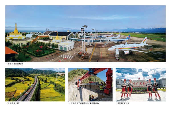 進入新時代,德宏邁上發展快車道,2015年,德宏第一條高速通車,路網、航空網、能源保障網、水網、互聯網“五網”建設隨之全面加速發力,在全省邊境州市率先實現“縣縣通高速”,如今全州公路總里程10037公里、農村公路8336公里、建制村公路通暢率100%。德宏成為全省首個擁有民用運輸機場和通用機場的州市,芒市國際機場吞吐量位列全省前列;大瑞鐵路加快建設,邊疆人民的“鐵路夢”正在變為現實。