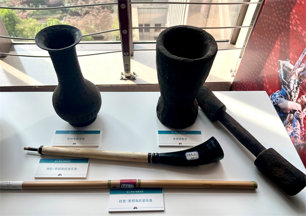 景頗族展廳展出的蔑花瓶、舂筒、吐良、洞巴