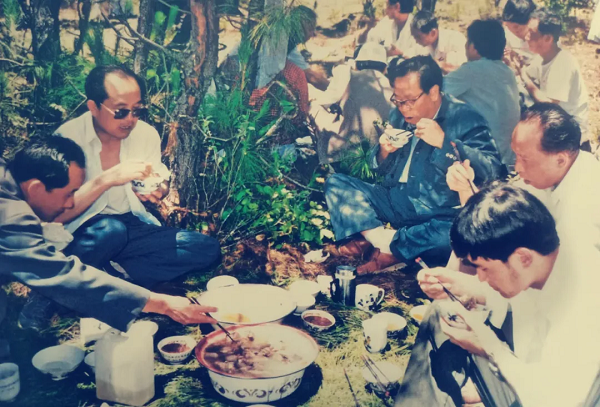 普朝柱同志下鄉調研途中,和工作人員一起席地而坐吃工作餐。