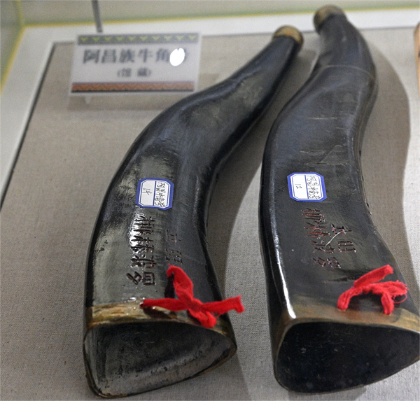 阿昌族展廳展出的牛角號(樂器)