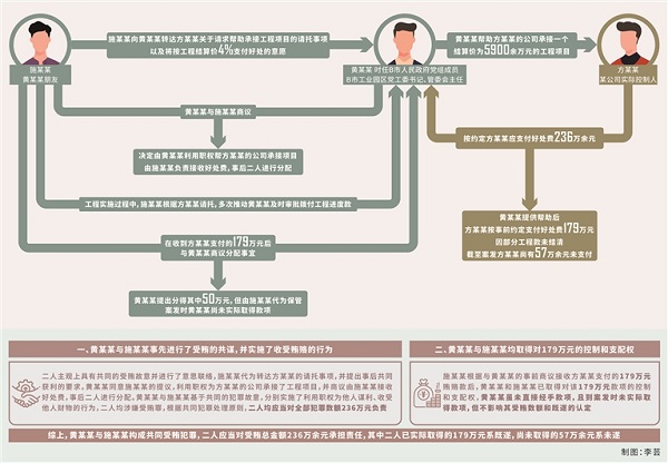 其中,2018年下半年,黃某某經朋友施某某介紹,認識某公司實際控制人方某某,后施某某向黃某某轉達了方某某關于請求幫助承接工程項目的請托事項,以及將按工程結算價4%支付好處的意愿。黃某某與施某某商議,決定由黃某某利用職權幫方某某的公司承接項目,由施某某負責接收好處費,事后二人進行分配。此后黃某某幫助方某某的公司承接一個工程結算價5900余萬元的工程項目,按約定方某某應支付好處費236萬余元。工程實施過程中,施某某根據方某某請托,多次推動黃某某及時審批撥付工程進度款,黃某某提供幫助后,施某某要求方某某按事前約定支付好處費,并在收到方某某支付的179萬元后與黃某某商議分配事宜。黃某某提出分得其中50萬元,但由施某某代為保管,案發時黃某某尚未實際取得款項。此外,因部分工程款未結清,截至案發方某某尚有57萬余元未支付。
