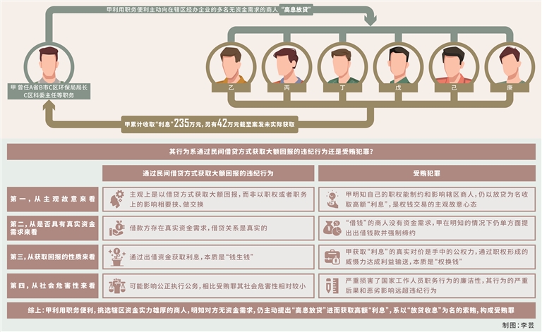 第三,從獲取回報的性質(zhì)來看,通過民間借貸方式獲取大額回報的違紀行為,實質(zhì)是以民間借貸方式從事營利活動,是通過出借資金獲取利息,本質(zhì)是“錢生錢”。而甲的行為,其真實的對價是手中的公權(quán)力,通過職權(quán)形成的威懾力達成利益輸送,本質(zhì)是“權(quán)換錢”。