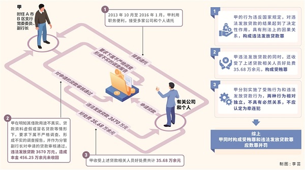 龍琎琎:甲除違反國家規定審核同意向相關公司或個人發放貸款3670萬元、造成本金456.25萬余元未收回,構成違法發放貸款罪外,還收受了上述貸款相關人員好處費35.68萬余元。有觀點提出,甲是在收取信貸客戶財物后才違法發放貸款,受賄和違法發放貸款構成牽連關系,應擇一重罪處罰,不應重復評價。