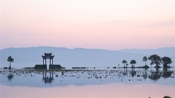 在薄霧的彌漫中,寒冬里的星云湖猶如一幅水墨畫。(李丹 攝)