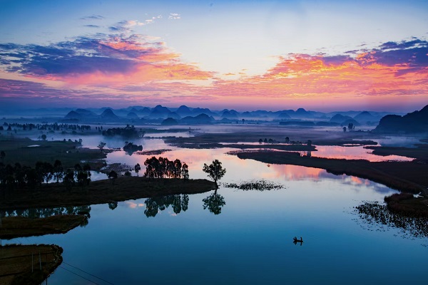 大寒時(shí)節(jié),普者黑座座層巒疊嶂的孤峰、點(diǎn)點(diǎn)星羅棋布的湖泊與綻放的云霞交相輝映。(梁艷 攝)