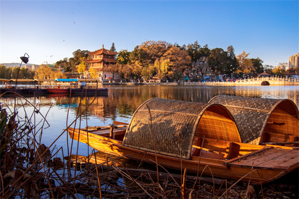 大寒時(shí)節(jié),昆明市大觀樓前湖畔的荷葉幾近凋零,正午陽(yáng)光灑下,映照出一抹明黃,為冬季添上一道明亮的色彩。(王廷彪 攝)