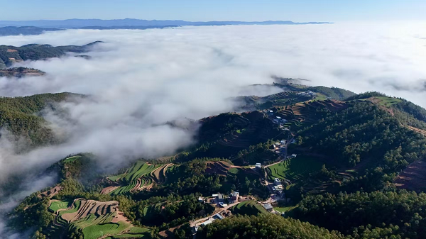 歲末大寒,晨間暖陽(yáng)輕拂,南華縣沙橋鎮(zhèn)的群山在霧氣繚繞間顯露青綠身姿。靜謐的村莊、碧綠的梯田,似乎已早早收到了春的訊息。(陸志堅(jiān) 攝)