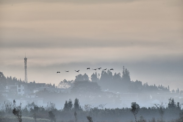 濃霧下的昌寧,墨色于素白間暈染。行在其中,一半霧色掩晨色,徐徐鋪陳開(kāi)一幅淡墨山水畫。(吳再忠 攝)