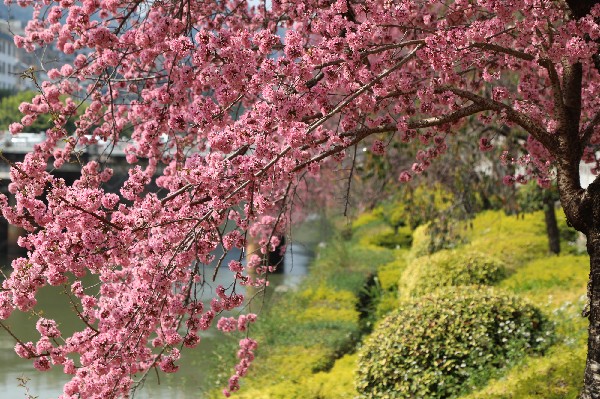 隨著天氣慢慢回暖,文山州一河道兩岸櫻花盛開,春的氣息越來越濃。(王銘堅 攝)
