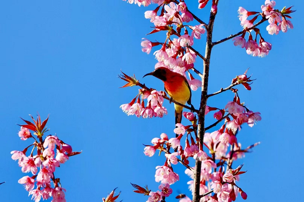在西雙版納州勐海縣,太陽鳥棲息在盛開的櫻花樹上,與湛藍的天空相映成趣。(巖拉 攝)
