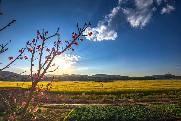立春時節,曲靖市馬龍區油菜花、桃花競相開放,與阡陌田壟相映成趣,處處彌散著濃濃春意。(方俊 攝)