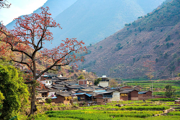 驚蟄臨至,山野初醒。大姚縣灣碧鄉木棉似火燃枝頭,村舍錯落臥綠野,田野泛新綠,山巒披薄紗,好一幅生機萌動的春日畫卷。(李長元 攝)