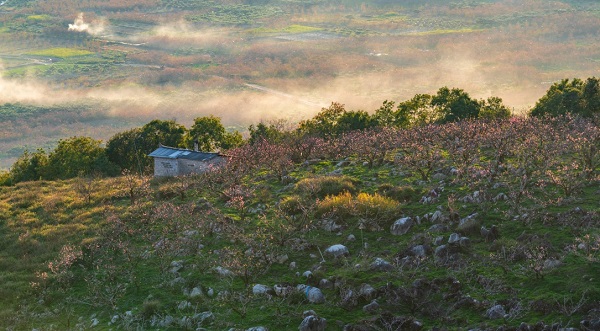 雨催驚蟄候,風作勒花開。雨水和暖風促進了萬物的蘇醒,在蒙自市文瀾街道布衣透村,遠處的薄霧和近處綻放的桃花林渲染出一幅生機勃勃的圖景。(李星 攝)