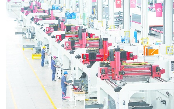 圖為國內(nèi)首條三維五軸激光切割裝備流線化智造生產(chǎn)線。華工科技供圖