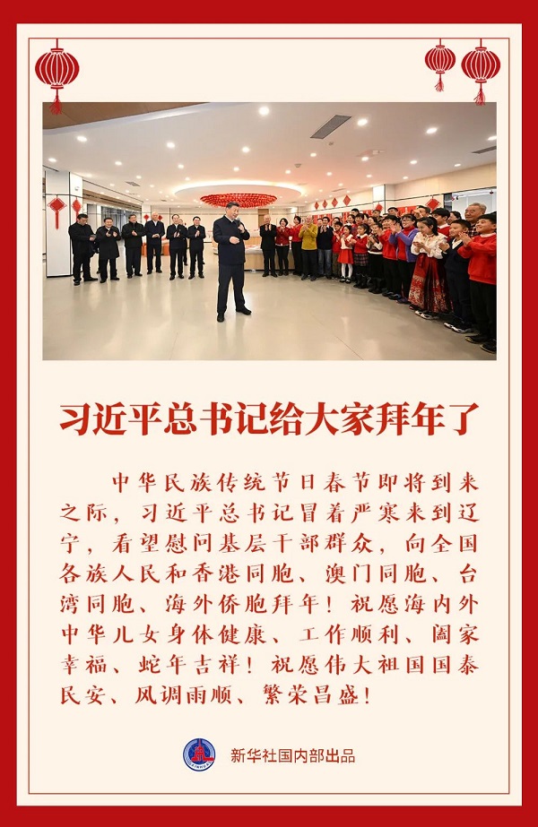 中華民族傳統節日春節即將到來之際,中共中央總書記、國家主席、中央軍委主席習近平冒著嚴寒來到遼寧,看望慰問基層干部群眾,向全國各族人民和香港同胞、澳門同胞、臺灣同胞、海外僑胞拜年!祝愿海內外中華兒女身體健康、工作順利、闔家幸福、蛇年吉祥!祝愿偉大祖國國泰民安、風調雨順、繁榮昌盛!