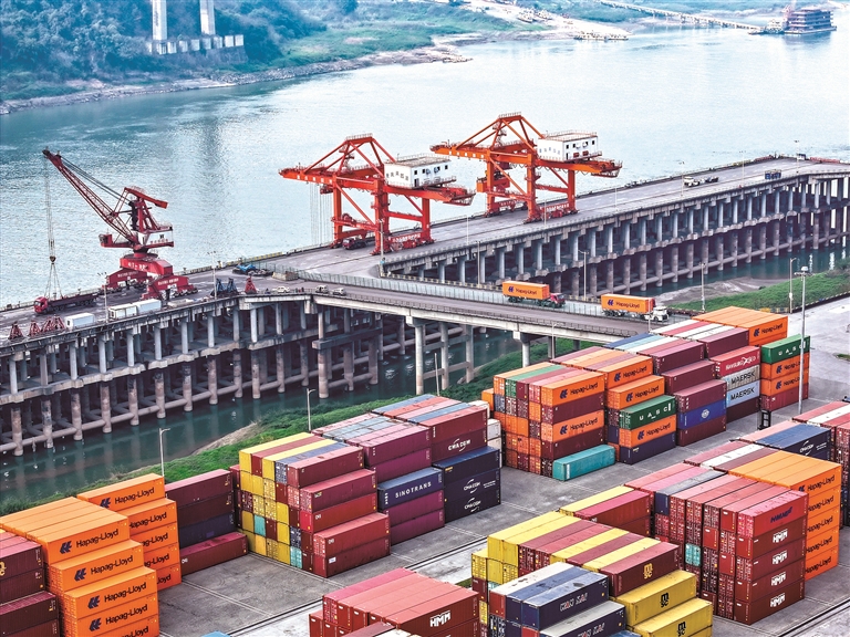 重慶兩江新區果園港是長江內河上游首個智能水平運輸與有人集卡智馭混行作業的港口。圖為近日拍攝的果園港。 新華社記者 唐奕 攝