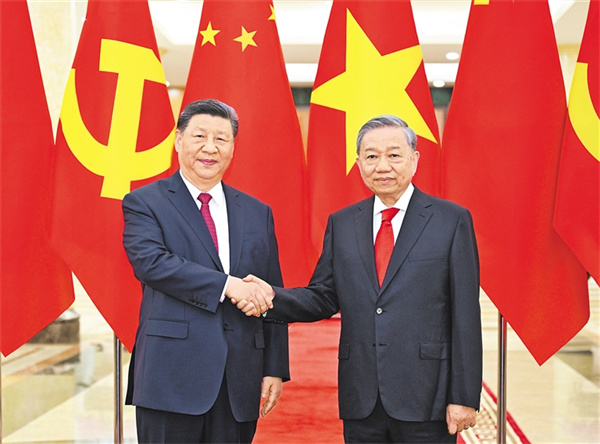 習近平強調,今年是中越建交75周年暨“中越人文交流年”。75年來,無論國際風云如何變化,雙方在爭取國家獨立和民族解放的斗爭中相互支持,在社會主義建設事業中攜手并進,在推進各自現代化進程中砥礪前行,成為社會主義國家團結合作的典范。面對變亂交織的國際形勢,中越兩國堅持和平發展,深化友好合作,為世界帶來了寶貴的穩定性和確定性。站在新的歷史起點上,雙方要繼往開來、攜手前行,賡續“越中情誼深、同志加兄弟”的傳統友誼,按照政治互信更高、安全合作更實、務實合作更深、民意基礎更牢、多邊協調配合更緊、分歧管控解決更好的“六個更”總體目標,高質量推動全面戰略合作,確保中越命運共同體建設行穩致遠,為構建人類命運共同體作出新的更大貢獻。