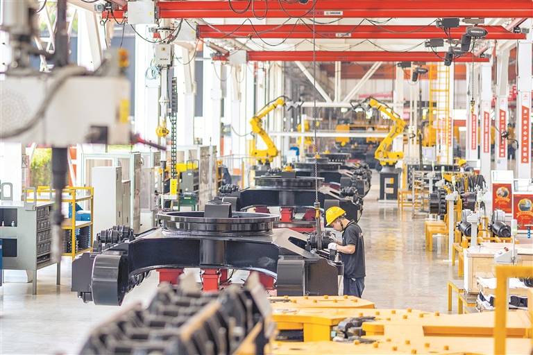4月21日,在位于重慶市兩江新區的一家機械制造企業,工作人員在總裝車間組裝即將出口老撾、緬甸的挖掘機。 新華社記者 黃偉 攝