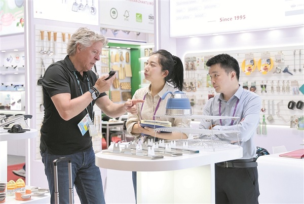 4月23日,第137屆廣交會第二期開幕,以“品質家居”為主題,集中展示家庭用品、禮品及裝飾品、建材及家具3大板塊15個展區。二期線下展覽總面積51.5萬平方米,參展企業10313家。圖為當日,客商在第137屆廣交會上選購廚具。 新華社記者 盧漢欣 攝