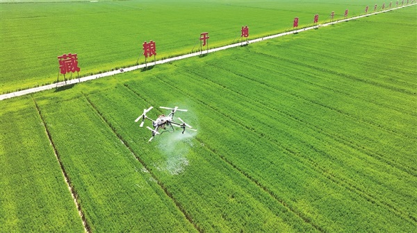 近年來,江蘇省宿遷市宿豫區多措并舉推動耕地保護責任落實,加快現代農業產業園核心區建設,保障糧食穩產增產。圖為近日,在該區新莊小麥單產提升示范區,無人機正在進行植保噴灑作業。 朱冠軍 攝