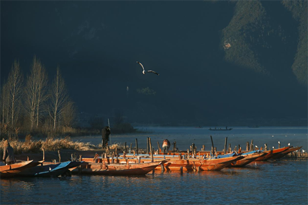 這個冬天,到瀘沽湖觀賞晨霧火了。清晨的第一縷陽光灑在湖邊的豬槽船上,遠處欣賞晨霧的游人已經出發去追尋湖心的美景,遠道而來的紅嘴鷗也醒來了。(李羿翥 攝)