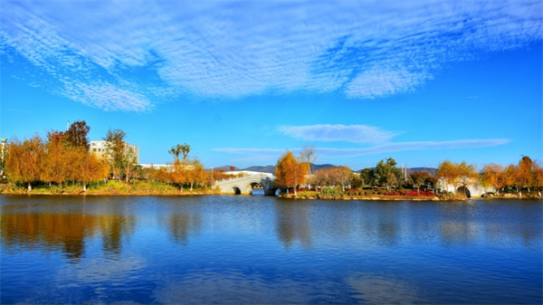 祥云玉波濕地公園呈現出最美的景致,漣漪的湖面、鱗狀的云層、斑斕的色彩,一幅恬淡的優美畫卷緩緩展現在眼前。(芮鴻壽 攝)