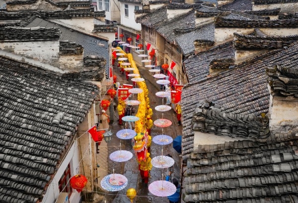 皖南小城的大街小巷被大紅燈籠和五顏六色的油紙傘裝點得流光溢彩、喜氣洋洋,處處洋溢著熱鬧喜慶的年味兒。(安徽省宣城市廣德市紀委監(jiān)委供 易成 攝)