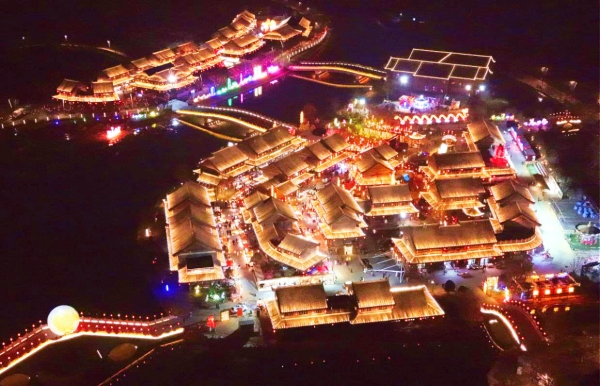 位于河南省鄭州市二七區(qū)的賈魯水鎮(zhèn)張燈結彩。一汪清水穿鎮(zhèn)而過,將水鎮(zhèn)分為兩島,三座石橋在燈光映襯下,像三條靈蛇守望兩島,祈求風調雨順、時和歲豐。(河南省鄭州市二七區(qū)紀委監(jiān)委供 王國富 攝)