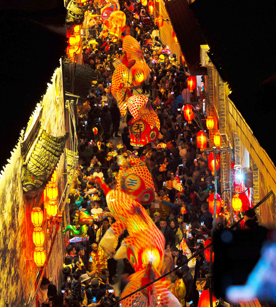 夜幕降臨、華燈初上,人潮涌動的皖南小城街頭,一場特色的魚燈舞表演點燃新春氛圍,表演者手持魚燈穿梭于城市的大街小巷,人們在流光溢彩的魚燈舞中祈愿新的一年風調雨順、五谷豐登。(安徽省廣德市紀委監委供易成攝)