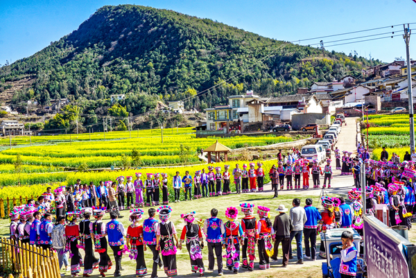 在彝族左腳舞的發源地云南省牟定縣蟠貓鄉,當地群眾身著彝族盛裝,載歌載舞,生動詮釋著當地春節的獨特韻味。(云南省牟定縣紀委監委供段紹東攝)