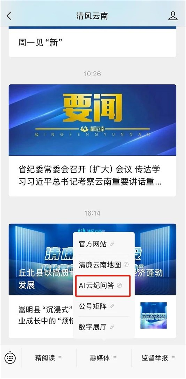 1.通過“清風云南”微信公眾號“融媒體”子菜單,點擊“AI云紀問答”