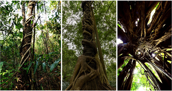 絞殺現(xiàn)象是原始森林中的一道奇特景觀。絞殺植物為半附生植物,它們的種子多被鳥或別的動(dòng)物帶到棕櫚樹、鐵杉樹等易于生長(zhǎng)的樹干上,等到發(fā)芽后其起初以卷須附生在支柱植物,隨后長(zhǎng)出氣生的網(wǎng)狀根系緊緊包圍樹干并向下擴(kuò)展,直到伸入地面下變?yōu)檎8担ㄗ髨D)。隨著時(shí)間推移,附生樹把里面的樹越包越緊,并搶奪寄主樹的營(yíng)養(yǎng),以自己的樹冠取而代之寄主樹冠,使其難見天日(中圖),最終寄主樹會(huì)因?yàn)闋I(yíng)養(yǎng)虧缺而死亡,從而形成中空的樹干(右圖)。絞殺現(xiàn)象警示我們要經(jīng)得住各種溫情脈脈的誘惑,牢記禍患常積于忽微、智勇多困于所溺,時(shí)刻保持清醒頭腦,警惕被“圍獵”、腐蝕和絞殺,始終做孤獨(dú)而堅(jiān)毅的忠誠(chéng)衛(wèi)士。