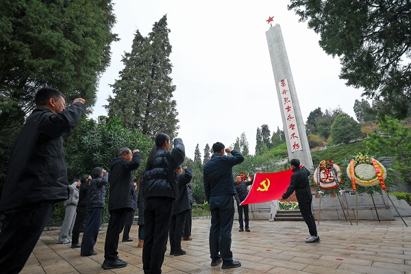 清明節,陸良縣紀委監委組織機關黨員干部赴青山烈士陵園開展“緬懷先烈憶初心 賡續血脈擔使命”主題黨日活動,通過向烈士紀念碑敬獻鮮花、重溫入黨誓詞等形式,緬懷先烈功績,接受深刻的黨性教育與精神洗禮。圖為陸良縣紀委監委黨員干部在烈士紀念碑前宣誓。通訊員 王勇